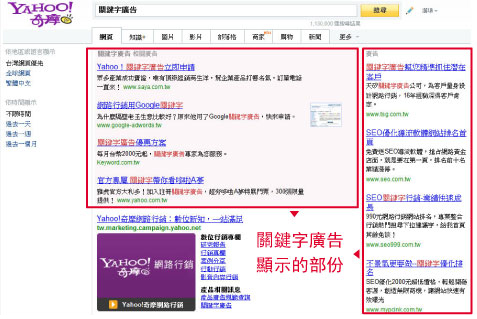 搜尋結果符合使用者( Users )的需求,商家( Advertiser )獲得了精準的客戶,而搜尋引擎廠商也因此獲得不錯的收入,達成了所謂三贏的局面,這也是導致關鍵字廣告市場蓬勃發展的原因;以台灣最主要的搜尋引擎為例,Yahoo! 奇摩 2005 年關鍵字廣告營收約 4 億元,2006 年則可望達到 10 億元 的規模。管理您的關鍵字