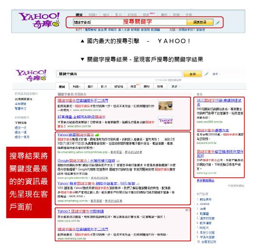 使用Yahoo!關鍵字可讓您的網站強勢曝光到最上方的位置,再配合SEO優化服務,就等於搶入成功的大門,讓您的網站的被搜尋的結果能夠成功的排進產業前幾品並可領導產業品牌。
